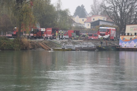 WELS-LAND - Eine groß angelegte Übung für rund 20 Einsatztaucher des Stützpunktes V wurde am Samstag, den 21. Oktober an der Schärdinger Innlände durchgeführt. Einsatztaucher von den fünf Feuerwehren Wels, Marchtrenk, Stadl-Paura, Ried und Schärding waren neben dem schweren 55to Bergekran aus Ried im Einsatz.