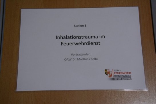 Einen interessanten Vortrag gestalteten Bezirks-Feuerwehrarzt BFA Dr. Christian Wiesinger mit Unterstützung des Roten Kreuz und des Arbeitersamariterbund über Frühdefibrillation und Reanimation. Bei weiteren Stationen wurde in einem Vortrag von OAW Dr. Matthias Kölbl das Inhalationstrauma im Feuerwehrdienst verständlich dargestellt. Die letzte Station wurde von Stellvertreter des Bezirks-Polizeikommandanten Oberstleutnant Erwin Pilgersdorfer über Suchaktionen nach vermissten Personen – Richtige Planung und Vorgehensweise unterrichtet.