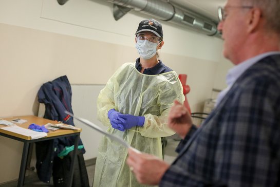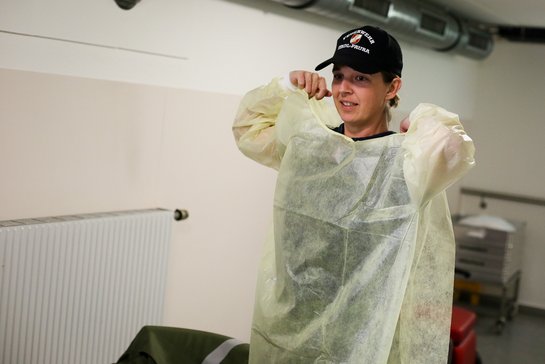 Zusammen mit hausinternem Medizin-Personal fĂŒhren die FeuerwehrkrĂ€fte unterstĂŒtzt durch einem externen Sicherheitsdienst eine Befragung gemÀà einer standardisierten Checklist, sowie einen ersten Gesundheitscheck durch. Je nachdem werden dann den Patienten spezielle Bereiche zugewiesen oder auch weitere SchutzausrĂŒstung wie Mundschutz, etc. ausgegeben.