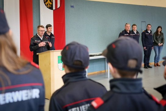Nachdem die einzelnen Turnusse alle Stationen erledigt haben, versammeln sich die Teilnehmer im Turnsaal, wo dann die Abzeichen durch die Bezirksfachbeauftragten für Jugendarbeit Werner Oberndorfer und Christoph Füreder übergeben werden. Das Strahlen der Jugendfeuerwehrmitglieder ist nicht zu übersehen und gegenseitig werden mit Stolz die soeben erworbenen Metallspangen an die Uniform geheftet.
